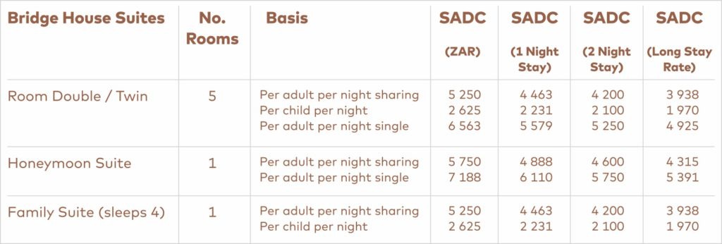 R5 450 per person per night sharing. (Normal Rate R7 750pppns)